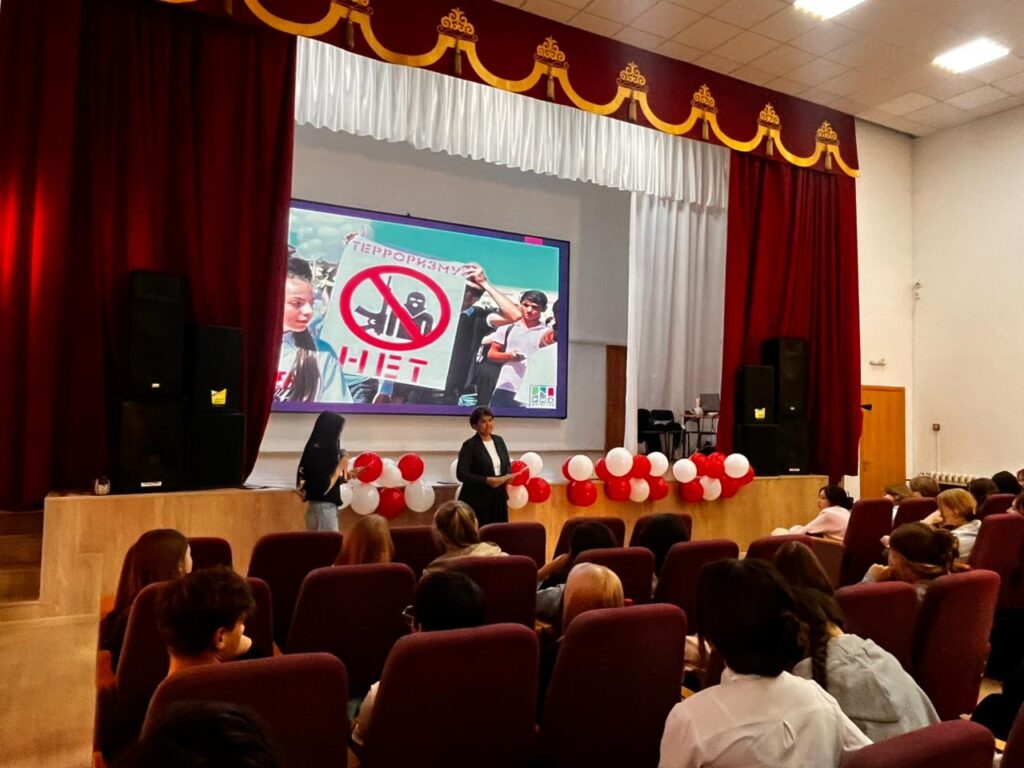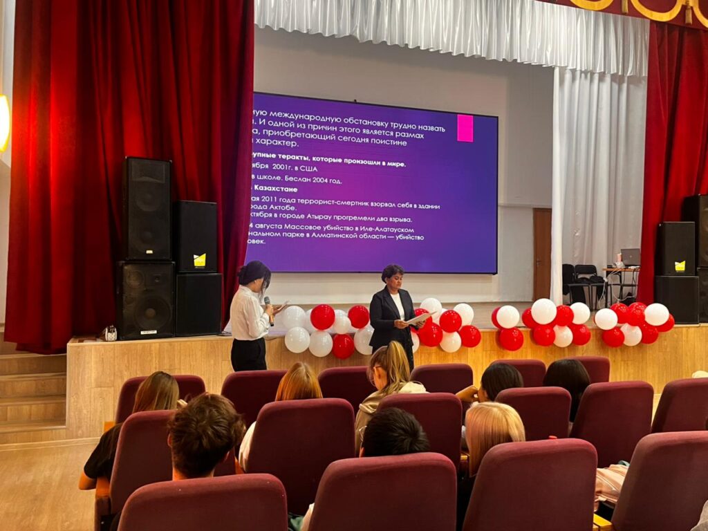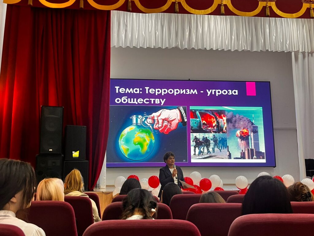 Цель мероприятия – расширение знаний у обучающихся представлений о терроризме и его последствиях; а также ознакомить с основными правилами поведения в условиях террористического акта. Лекция была подготовлена руководителем информационно-разъяснительной работы Ерназаровой А.Е., она обратила внимание на то что современную международную обстановку трудно назвать стабильной. И одной из причин этого является терроризм, приобретающий сегодня поистине всемирный характер. Привела факты о мерах ответственности в рамках существующего законодательства РК в случаях пособничества религиозным экстремистам и террористам.