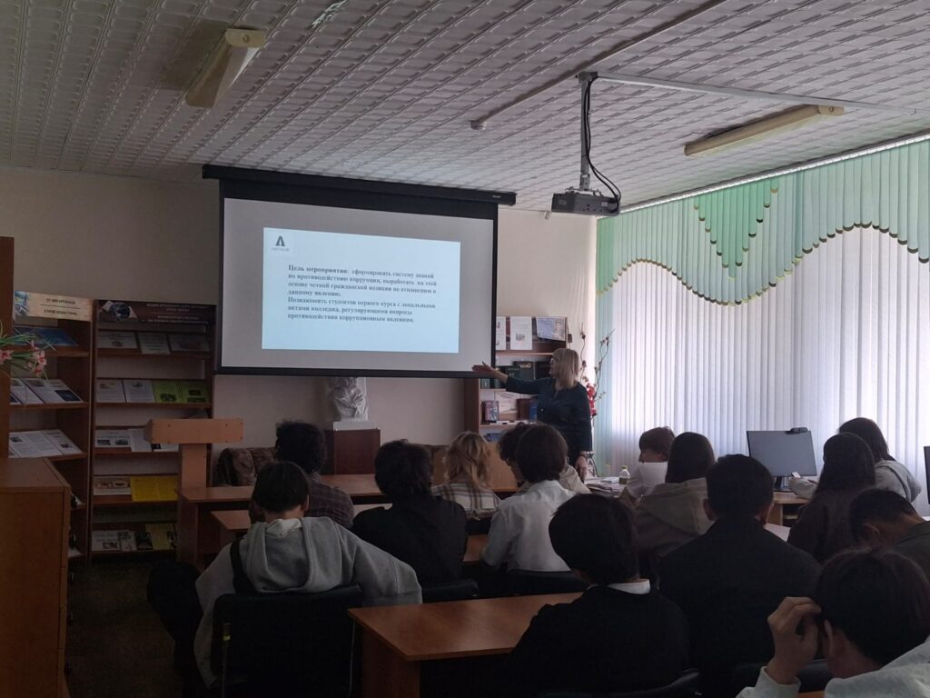 Цель данного мероприятия состояла в том, чтобы содействовать формированию антикоррупционного мировоззрения, повышению правовой культуры студентов нового набора колледжа, а также познакомить ребят с основными направлениями антикоррупцинной политики в нашем государстве.