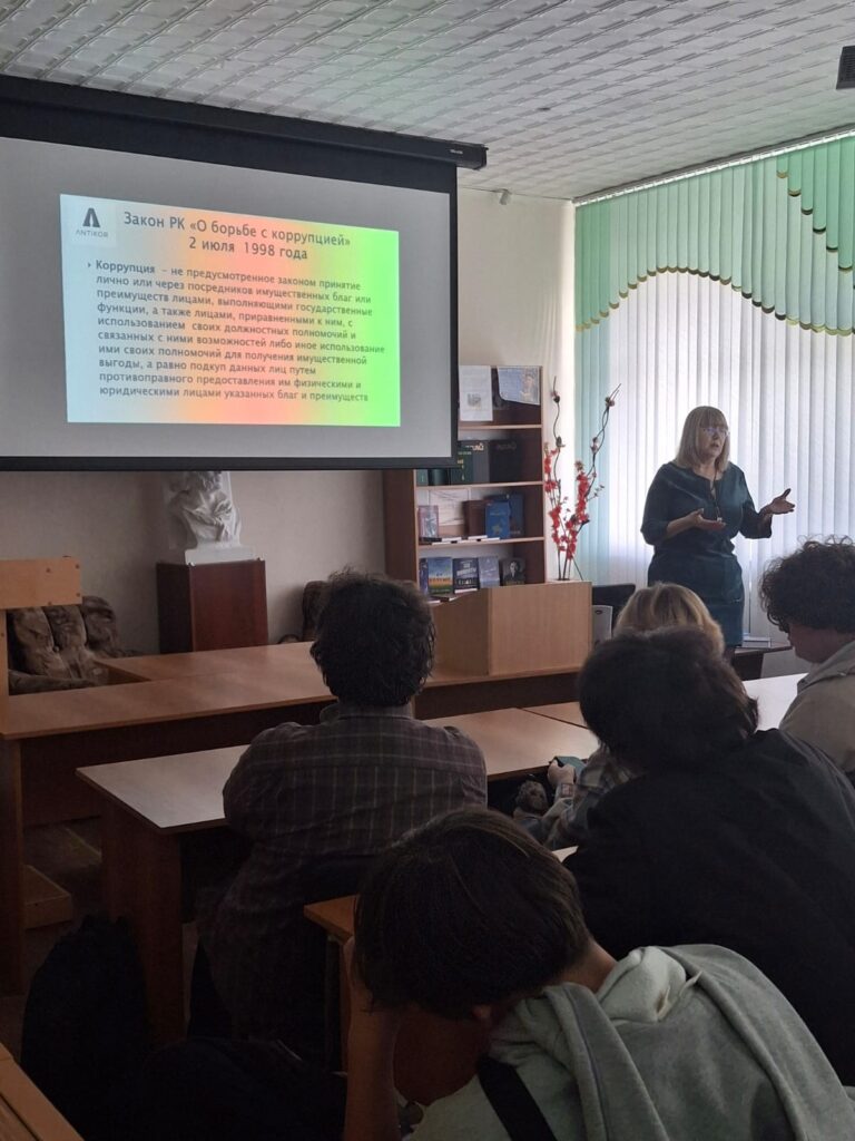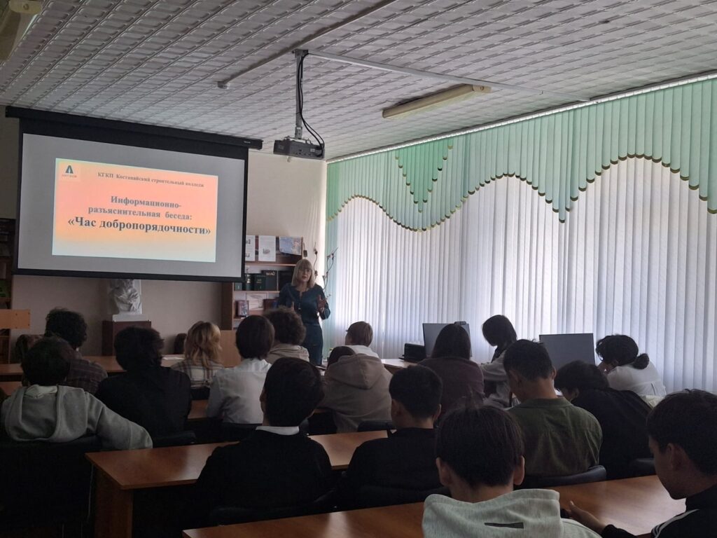 16 сентября 2025 года в рамках реализации комплексного плана по продвижению антикоррупционной культуры, для студентов первого курса Технического отделения Костанайского строительного колледжа была организована и проведена информационно – разъяснительная беседа «Час добропорядочности», ответственная за проведение мероприятия – представитель комлаенс службы колледжа Вельгоша Г.В.