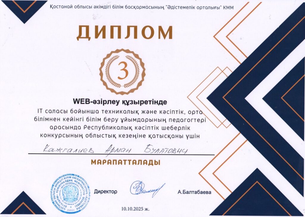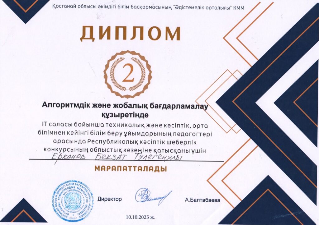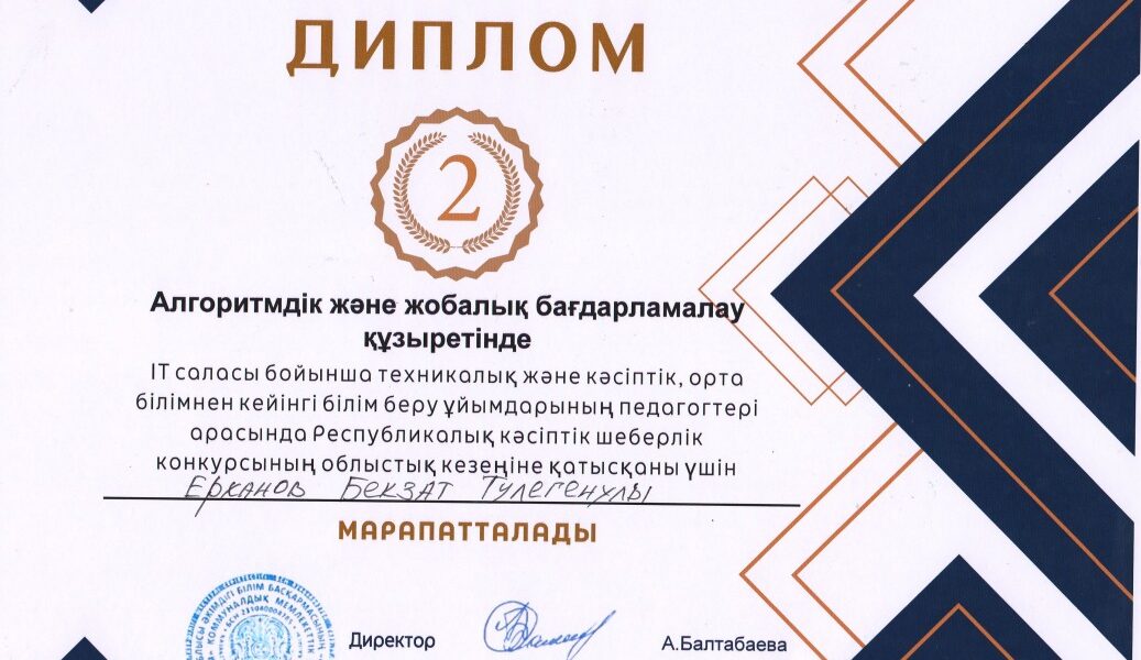 Преподаватели Костанайского строительного колледжа достойно представили своё учебное заведение:  Бекзат Ерханов — II место в компетенции «Алгоритмическое и проектное программирование», Арман Кажгалиев — III место в компетенции «WEB-разработка».