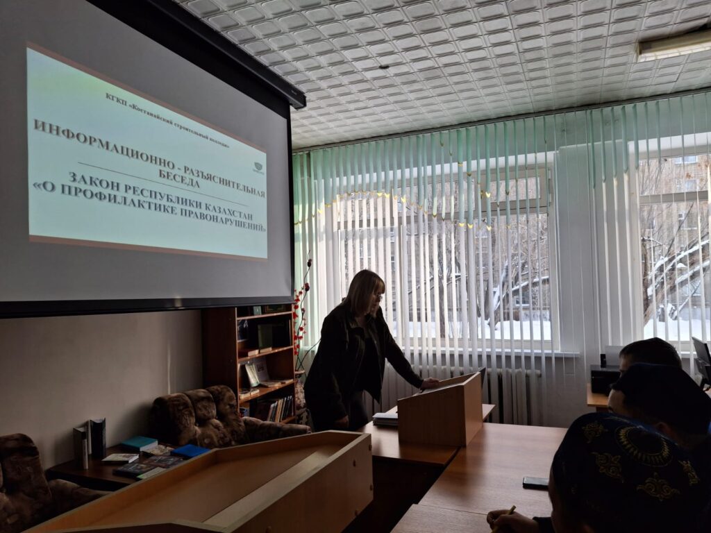 23января 2026 года в КГКП «Костанайский строительный колледж» в соответствии с протоколом заседания Межведомственной комиссии по профилактике правонарушений при Правительстве РК от 25 декабря 2025 года, была проведена информационно-разъяснительная   беседа по новому Закону  Республики Казахстан «О  профилактике правонарушений».