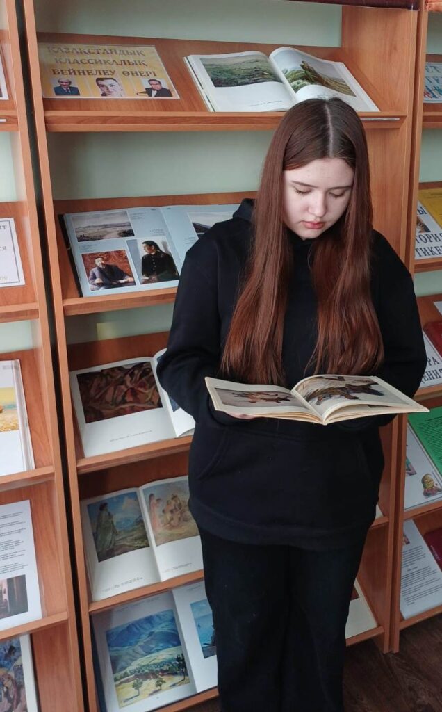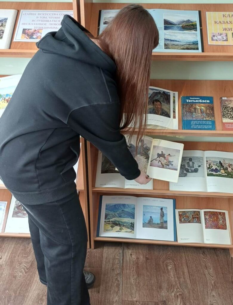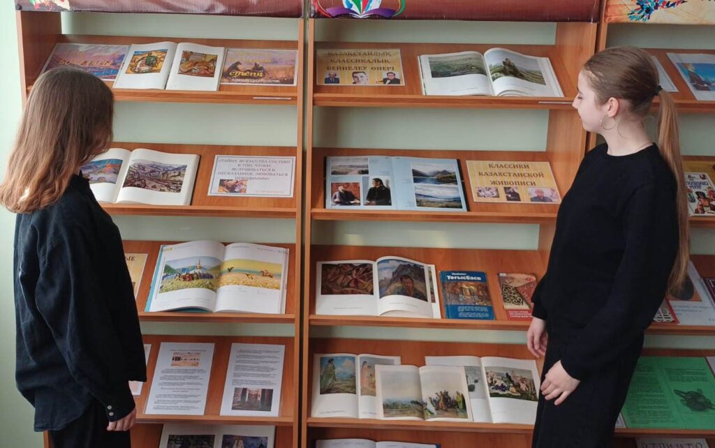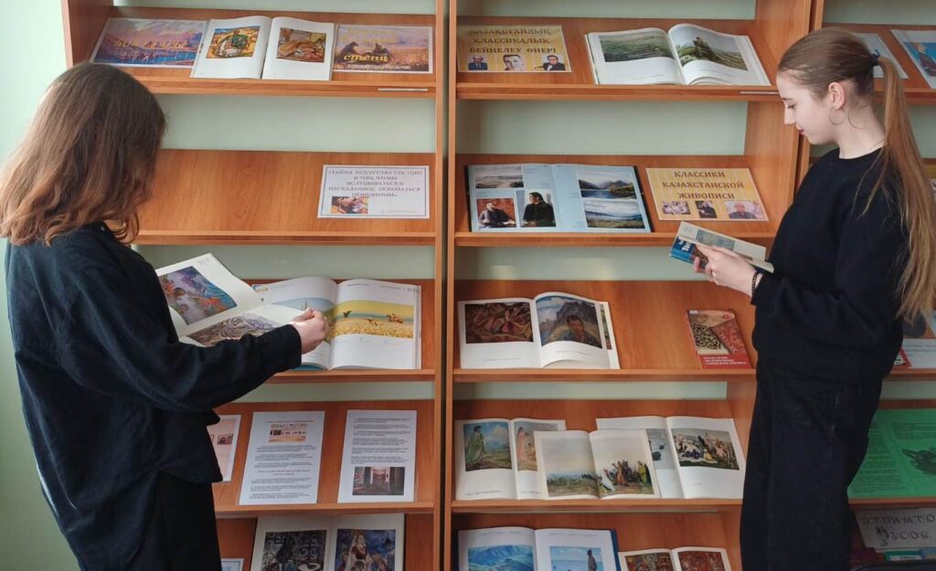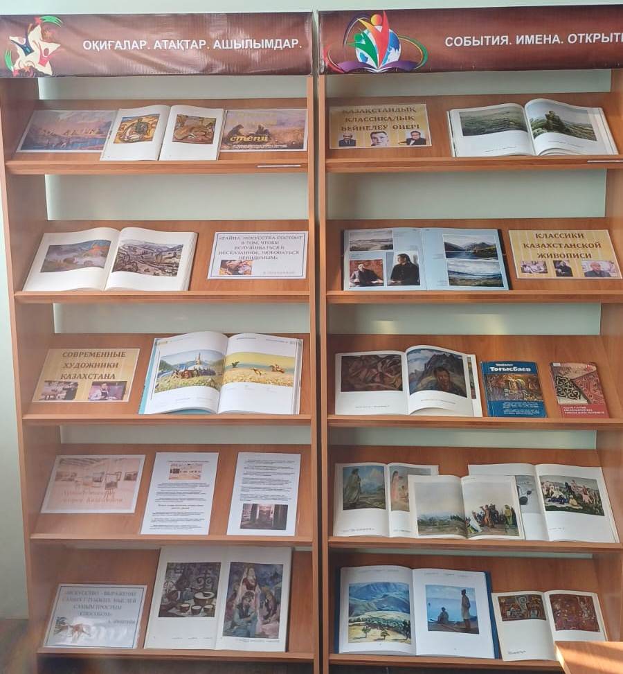 В экспозиции были представлены издания о жизни и творчестве первого профессионального художника Казахстана – Абылхана Кастеева. Студенты познакомились с альбомами репродукций его известных работ, отражающих историю становления страны, красоту казахской степи и традиционный уклад жизни народа. Отдельный раздел был посвящён художникам ХХ века Гульфайрус Исмаиловой, Молдрахмета Кенбаева и другим мастерам, чьи произведения стали значимой частью культурного наследия страны.