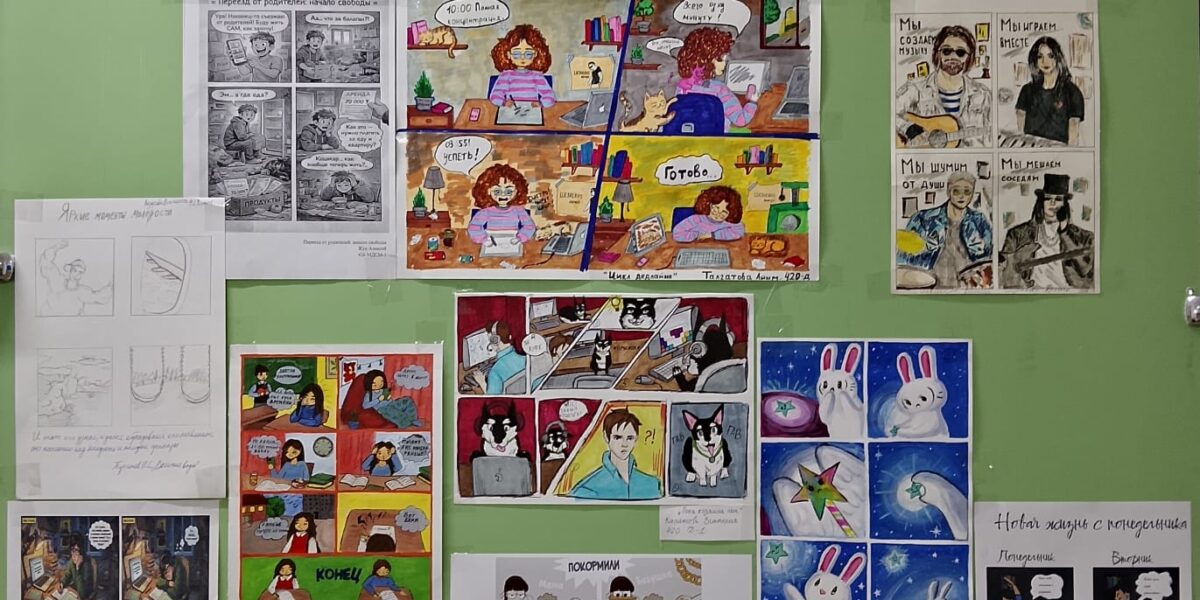 В стенах колледжа, где наука и учебники занимают центральное место, на этот раз главной темой стали — комиксы! Студенты, вооруженные кистями и красками, оживили сюжеты, полные иронии, добродушия и безграничного оптимизма. Они не просто рисовали – они проживали «Яркие моменты молодости» заново, вынося на бумагу то, что согревает душу, заставляет улыбнуться и напоминает: даже самые обыденные ситуации могут стать источником неиссякаемого вдохновения, если посмотреть на них глазами художника. Каждая линия, каждый штрих, каждая карикатурная деталь – все это было пропитано стремлением удивить, рассмешить, заставить задуматься и, конечно же, поделиться своим уникальным видением студенческой жизни.