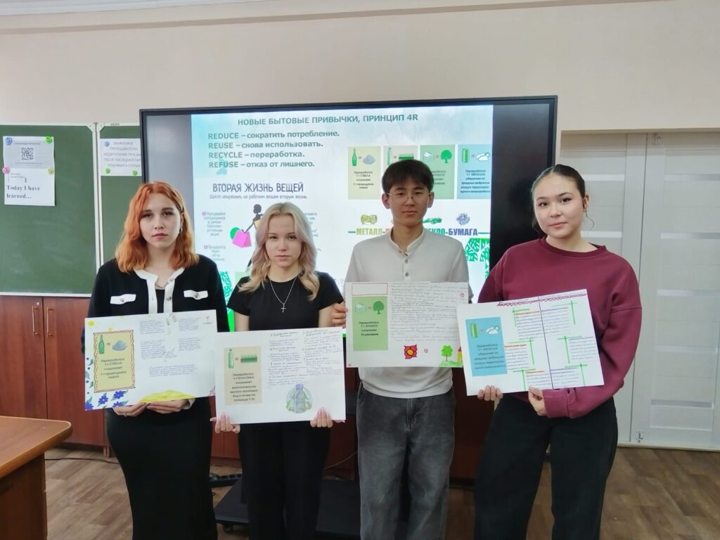 14 апреля 2026 г. в рамках реализации проекта «Қамқор» преподавателем ООД Геря В.Г. проведен экологический час «Жизнь в стиле эко». Основная цель экологического часа – формирование у обучающихся экологической грамотности и сознательности. Тема экологичного образа жизни сегодня является важной составляющей нашего будущего и это должно стать не просто экологичным образом жизни, а экологичным образом мышления. Жизнь в стиле ЭКО позволит спасти планету, улучшить экологическую ситуацию и укрепить здоровье, страдающее от загрязненной атмосферы. В ходе проведения мероприятия обучающиеся отвечали на вопросы экологической викторины «Чистые игры»; обосновывали важность вторичной переработки стекла, пластика, металлов и бумаги; расшифровывали маркировки по изготовлению и утилизации продукции; выполняли творческое задание – представили проект по созданию экодома, экоавтомобиля, экоодежды, экопродуктов, развитию экотуризма.